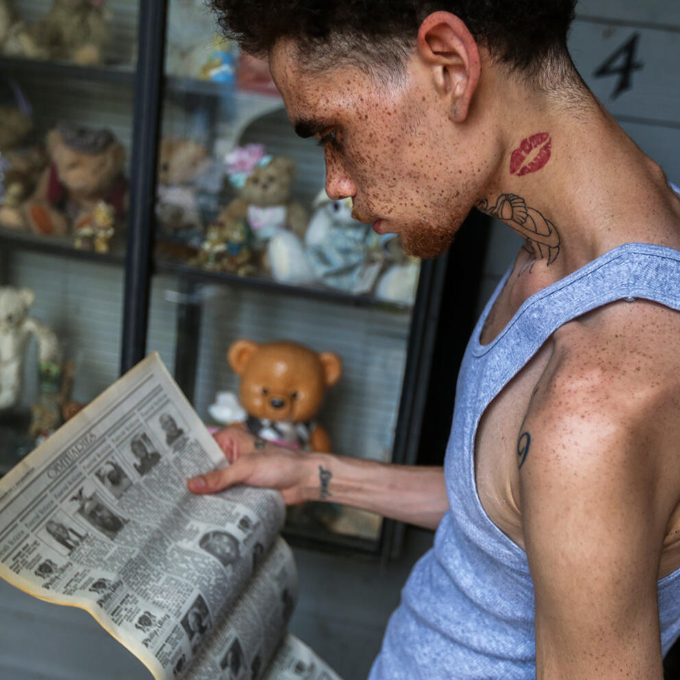 Noah Bradley displays an obituary on Saturday, March 27, 2021, for his father, Stacey Bradely, who died of COVID-19 in July. (Photo by Chasity Maynard // Alligator Staff)